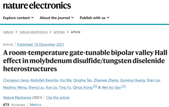 近日,我校8x8x 青年教师马惠在《自然·电子学》(《Nature Electronics》)上发表了题为《A room-temperature gate-tunable bipolar valley Hall effect in molybdenum disulfide/tungsten diselenide heterostructures》的研究成果。马惠为该论文的共同第一作者,新加坡南洋理工大学高炜博教授和清华大学物理系熊启华教授为通讯作者。该项成果为马惠2018年在新加坡南洋理工大学做访问学者期间与合作者共同开展,并于访学回国后持续合作完成的。《Nature Electronics》是有重要影响的国际学术期刊,影响因子长期保持在30以上。