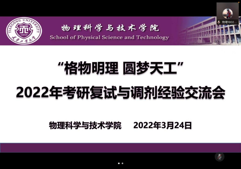 群策群力,同向同行。为切实做好毕业生就业指导与服务工作,3月24日8x8x 举办了主题为“格物明理 圆梦天工”的考研复试与调剂线上经验交流会。学院党委副书记贾彦军,副院长廖帮全,科研办主任陈琮老师、教师代表、全体辅导员以及2018级考研学子参加了本次会议。会议由党委副书记贾彦军主持。