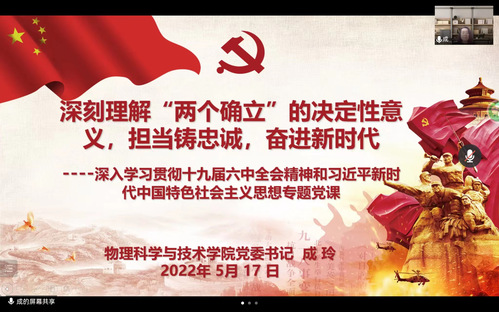 2022年5月17日晚,8x8x 党委书记成玲以“深刻理解‘两个确立’的决定性意义,担当铸忠诚,奋进新时代”为题讲授专题党课。本次专题党课是深入学习贯彻习近平新时代中国特色社会主义思想和党的十九届六中全会精神的一次主题宣讲,也是学院党委理论学习中心组扩大学习和干部专题培训。学院党委委员、学院领导班子成员、各基层党支部书记、各系室(中心)主任以及各办公室行政管理人员聆听了本次党课。