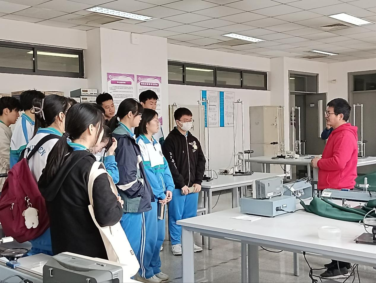 邹老师对学生们的来访表示热烈的欢迎,并介绍了学院专业特点和学生考研、就业等情况。随后,汇文中学学生分批参观了物理实验中心的力学、热学、声学、光学和电学实验室。在光学实验室,学生们学习、试做了单缝衍射、双缝干涉、牛顿环、劈尖和测透镜焦距等光学实验。在声学实验室,学生们观察了超声波的产生、发射和接收装置,了解了用驻波法和相位比较法测量声速的方法。通过实验近距离观察了物理现象的美,体会了巧妙的实验构思,激发了好奇心和求知欲。