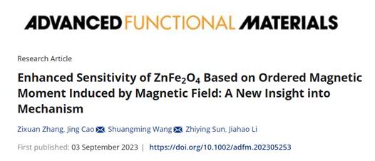 8x8x 曹静课题组近期在《Advanced Functional Materials》发表题目为Enhanced Sensitivity of ZnFe2O4 Based on Ordered Magnetic Moment Induced by Magnetic Field: A New Insight into Mechanism的研究成果。该工作的第一作者为硕士研究生张子瑄,曹静和王双明为该论文的通讯作者。
