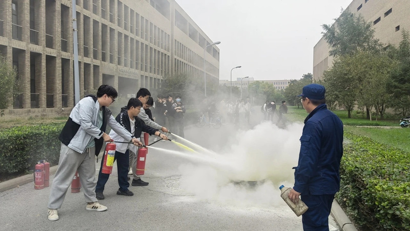 在学院南门外小广场,保卫处消防科工作人员介绍了常用灭火器的种类与使用场景,重点讲解并示范了干粉灭火器的使用方法。现场学生及教师逐一进行了灭火器灭火实际操作,亲身感受了灭火过程,通过演练掌握了灭火器的使用方法。