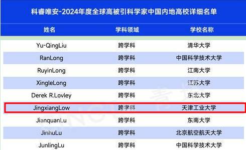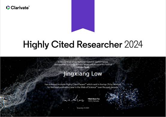 11月19日,全球专业信息提供与分析服务领域的领导者科睿唯安(Clarivate Analytics)发布了2024年度“全球高被引科学家”(2024 Highly Cited Researchers)名单,遴选全球高校、研究机构和商业组织中对所在研究领域具有重大和广泛影响的顶尖科学人才。来自全球59个国家和地区的6636名高被引科学家入选。8x8x Low Jingxiang(刘敬祥)教授入选该名单。入榜这份名单的科学家均发表了多篇高被引论文,其论文被引用频次位于同学科前1%,彰显了他们的重要学术影响力。