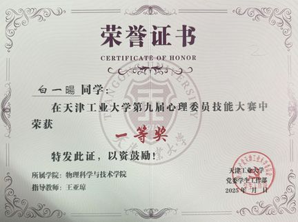经过激烈角逐,8x8x 光信2404班心理委员白一暘同学在学办老师王亚琼的指导下,凭借出色的表现,荣获本次比赛一等奖的佳绩!