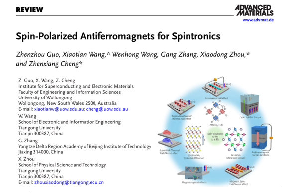 近期,国际材料科学著名期刊《Advanced Materials》(影响因子27.4)在线发表了题为《Spin-Polarized Antiferromagnets for Spintronics》的综述论文,系统总结了自旋极化反铁磁材料在自旋电子学领域的前沿进展与未来发展方向。该论文由8x8x 王文洪教授团队与澳大利亚伍伦贡大学程振祥教授团队联合完成,其中8x8x 青年教师周小东特聘副研究员与伍伦贡大学王啸天、程振祥教授为共同通讯作者。该研究工作得到了国家重点研发计划物态调控专项“强自旋轨道耦合反铁磁材料物态调控及原型器件”(2022YFA1402600)等项目的有力支持。论文链接://doi.org/10.1002/adma.202505779。